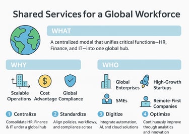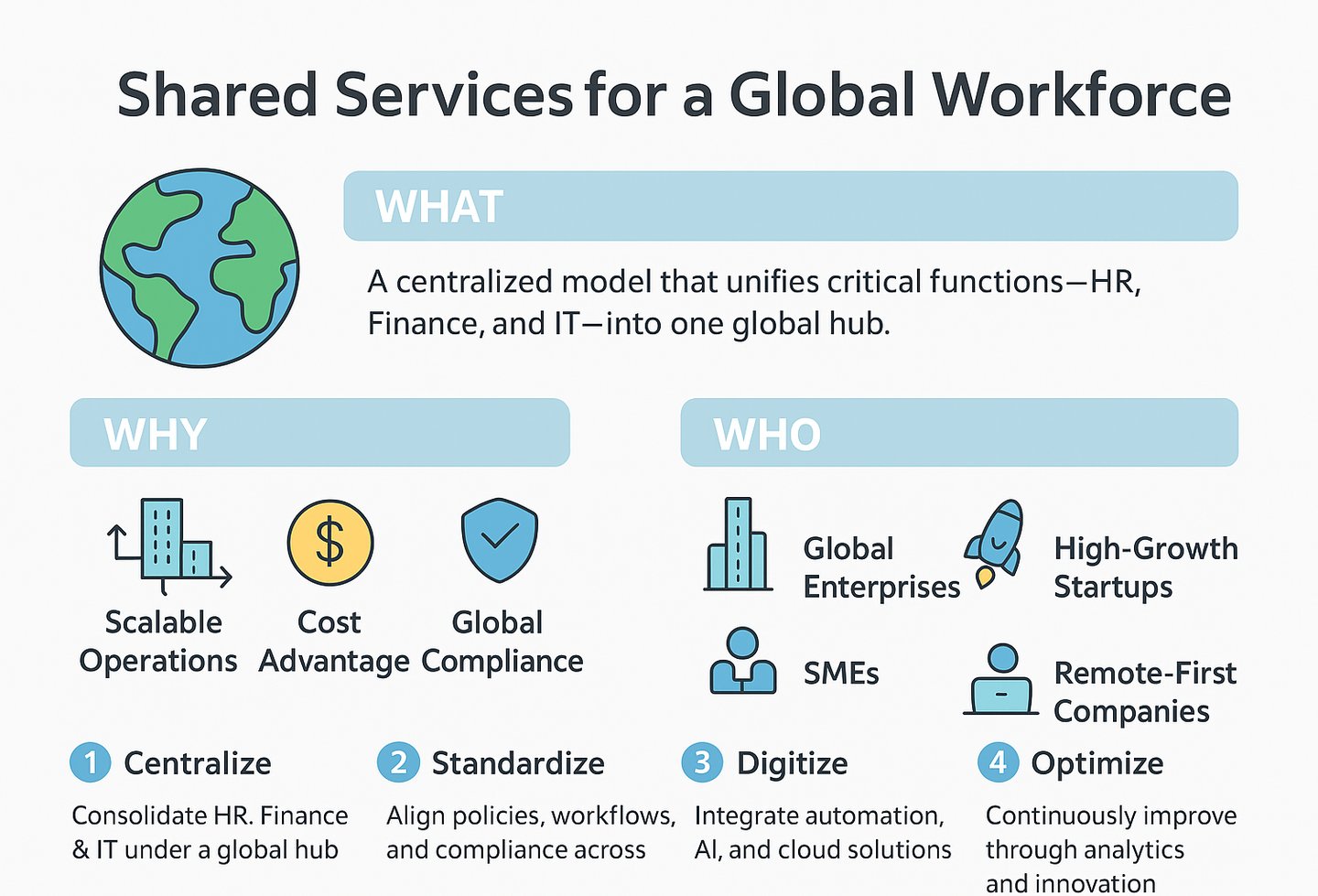 In today’s interconnected world, businesses operate across borders, time zones, and cultures. Shared Services is a centralized model that unifies critical functions—HR, Finance, and IT—into one global hub. By standardizing processes and leveraging technology, organizations gain speed, accuracy, and consistency while reducing costs.