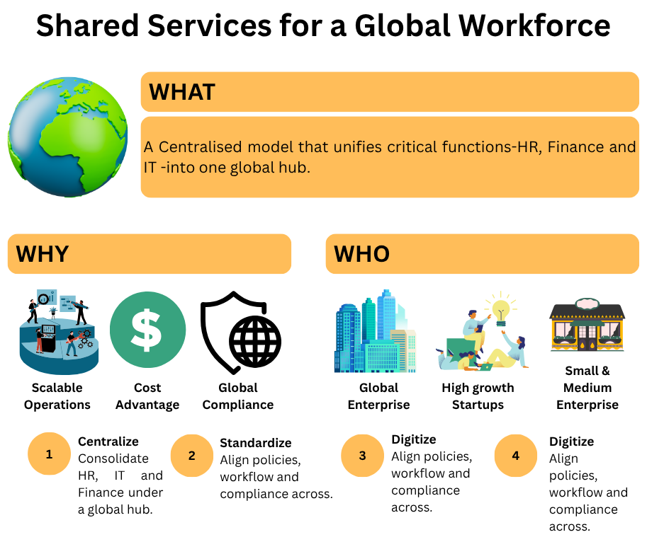 In today’s interconnected world, businesses operate across borders, time zones, and cultures. Shared Services is a centralized model that unifies critical functions—HR, Finance, and IT—into one global hub. By standardizing processes and leveraging technology, organizations gain speed, accuracy, and consistency while reducing costs.